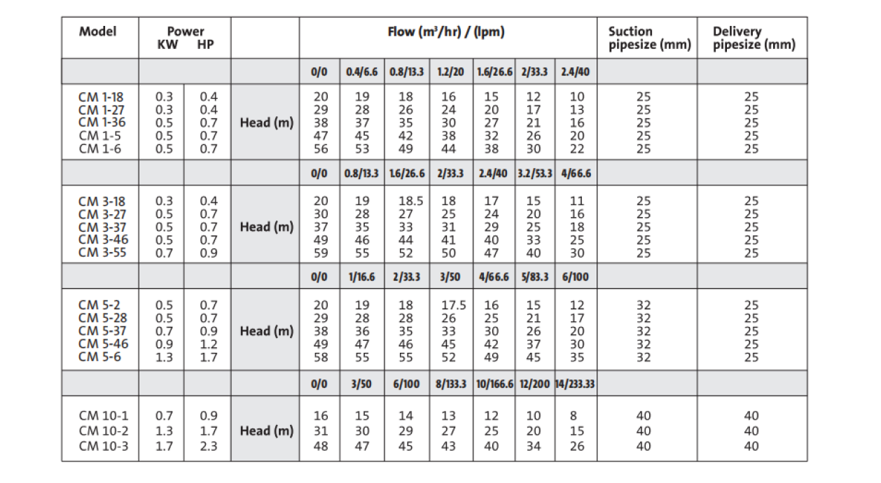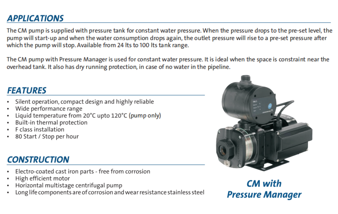 The CM pump is supplied with pressure tank for constant water pressure. When the pressure drops to the pre-set level, the pump will start-up and when the water consumption drops again, the outlet pressure will rise to a pre-set pressure after which the pump will stop. Available from 24 lts to 100 lts tank range. The CM pump with Pressure Manager is used for constant water pressure. It is ideal when the space is constraint near the overhead tank. It also has dry running protection, in case of no water in the pipeline.